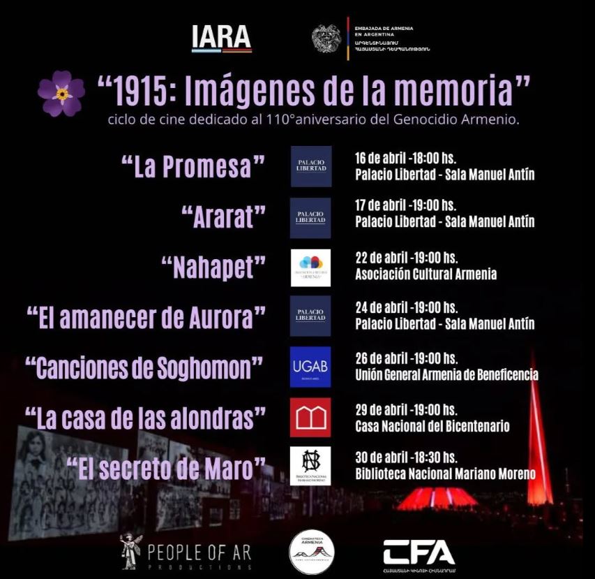 El programa se extiende al lunes 28 de abril a las 19 en el teatro Avenida (Avenida de Mayo 1222), donde se celebrará un acto cívico organizado por Instituciones Armenias de la República Argentina (IARA), con la participación de la Orquesta de Aeropuertos Argentinos que dirige Néstor Tedesco junto al Coro de las 110 Voces (a cargo de Santiago Chotsourian), León Gieco, Lito Vitale y la cantautora Alín Demirdjian.