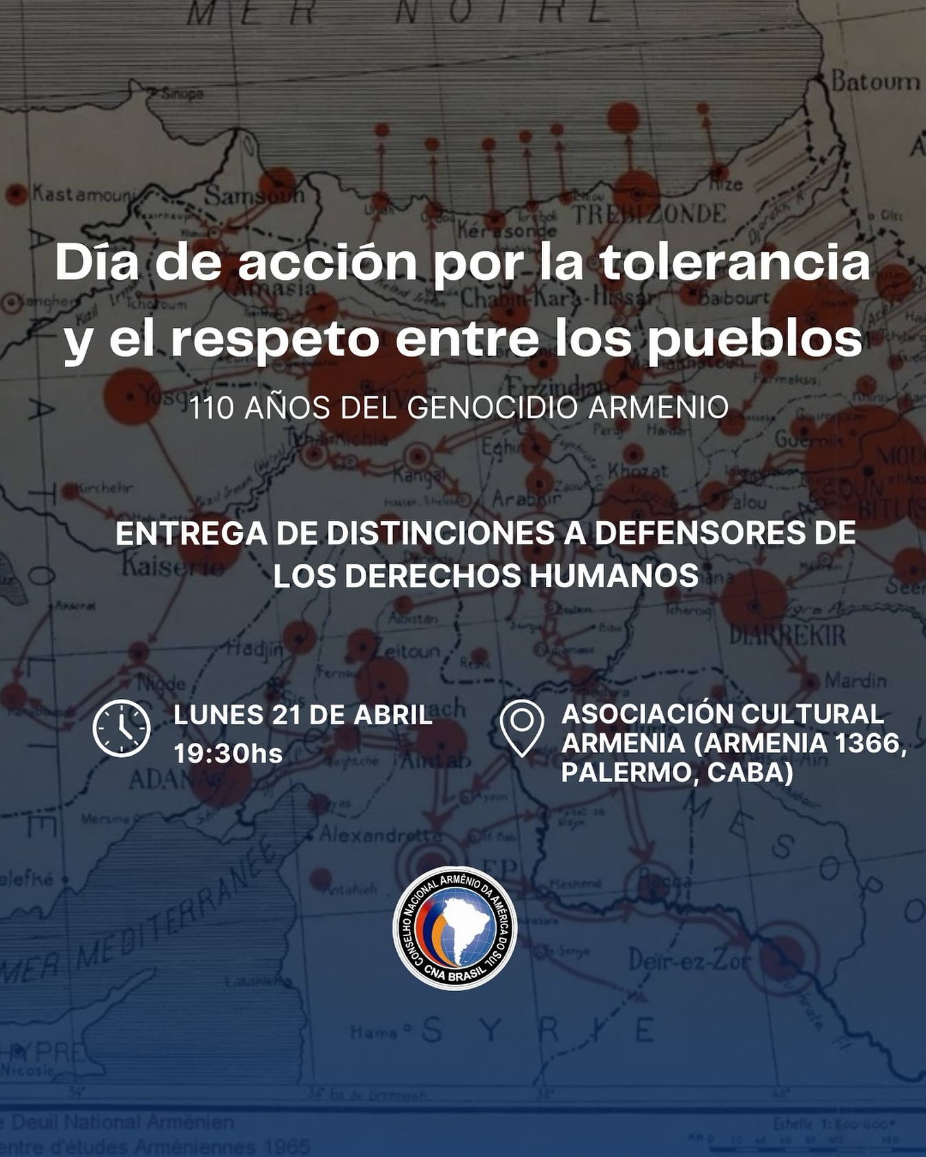 Lanzan decenas de actos por el 110° aniversario del Genocidio Armenio Se extenderán del 21 al 28 de abril, aunque el 24 de abril es el Día de Acción por la Tolerancia y el Respeto entre los Pueblos, como establece la ley 26.199 sancionada en 2007 por el Congreso nacional en reconocimiento de ese crimen de lesa humanidad.