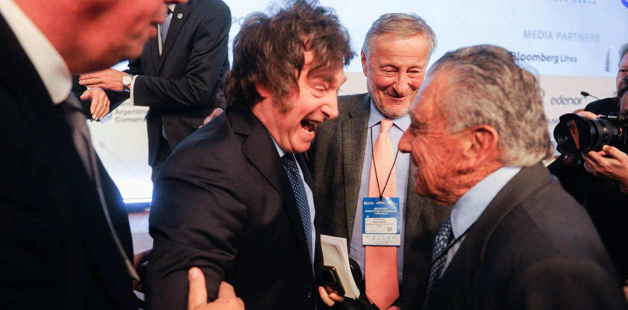 El Presidente de Argentina, Javier Milei, saludando al empresario de origen armenio Eduardo Eurnekian, en una reunión del Council de las Américas.