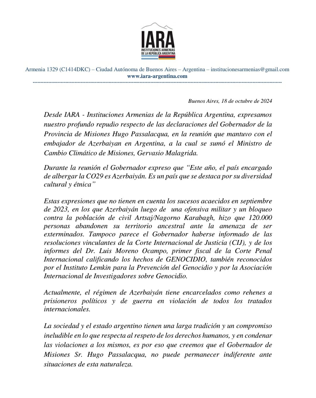 Desde IARA, Instituciones Armenias de la República Argentina, expresamos nuestro profundo repudio respecto de las declaraciones del Gobernador de la Provincia de Misiones Hugo Passalacqua, en la reunión que mantuvo con el embajador de Azerbaiyán en Argentina, a la cual se sumó el Ministro de Cambio Climático de Misiones, Gervasio Malagrida.