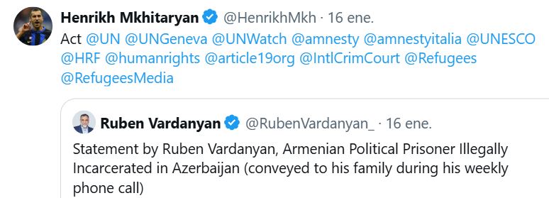 Mkhitaryan compartió la declaración del ex ministro de Estado de Nagorno Karabaj, Ruben Vardanyan, y utilizó los hashtags «Libertad para Ruben Vardanyan. Libertad para los prisioneros armenios».