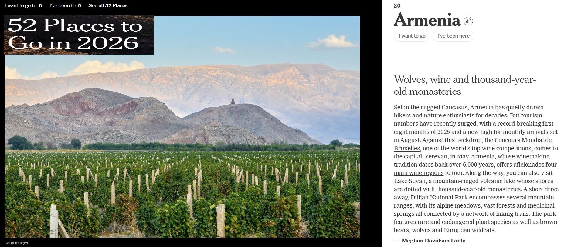 The New York Times, una de las publicaciones más influyentes del mundo, ha incluido a Armenia entre sus destinos de viaje recomendados para 2026 , ubicándola en el puesto 20 de la lista de los mejores lugares del mundo para visitar: