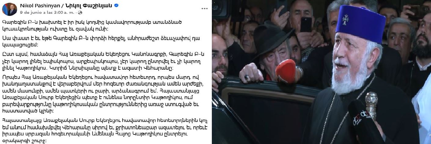 «Las declaraciones del primer ministro han causado una indignación generalizada entre los hijos de nuestra nación», declaró el Catolicós.